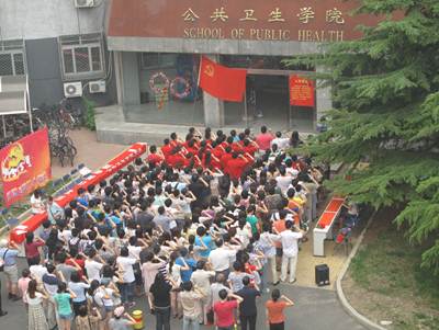 2011年6月29日上午,公共卫生学院“坚定信仰,忠诚奉献”庆祝建党九十周年主题活动在学院门前隆重举行。医学部党委副书记李文胜出席了本次活动。公共卫生学院各党支部书记、离退休党员、教工和学生党员200余人参加了庆祝活动。