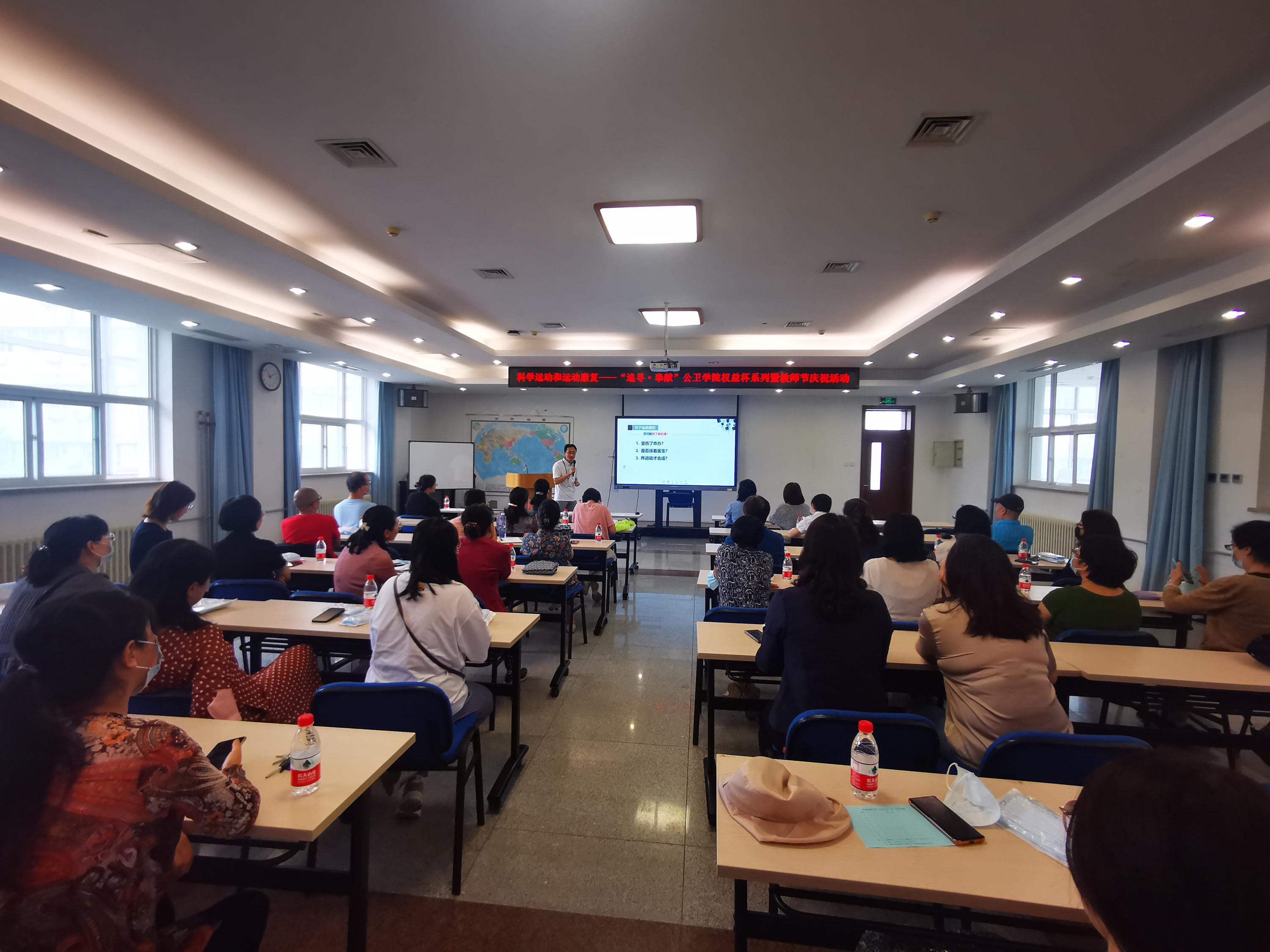 在第37个教师节来临之际,2021915日,公卫学院“追寻·奉献”权益杯系列活动暨庆祝教师节特别企划在卫三教举办。此次活动邀请北京大学第三医院运动医学研究所主任医师杨渝平老师为公卫人深度分享“科学运动和运动康复”的理念。本次活动得到了各系室的积极相应,50余位教职工参与其中,公共卫生学院党委副书记工会主席詹思延教授出席并主持讲座。
