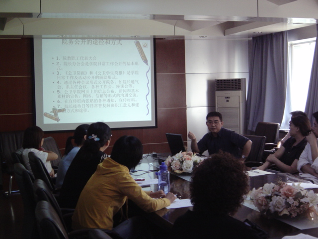 而基层单位的院务公开、政务公开正是将此要义落到实处,为了单位持续发展、以人为本,进入良性循环搭建平台。作为我们自身来讲,政务公开的意义正是在于创建世界一流大学的需要,是完善民主管理、民主监督的一个重要途径,是党的民主作风的具体体现。徐主席就院务公开的原则、内容和形式、具体事项以及途径和方式一一做了详细解读。同时也将我院如何开展院务公开实际情况及做法向大家作了详细说明。几个小时的培训课不知不觉的过去,同志们都感到生动、有亮点、有收获。