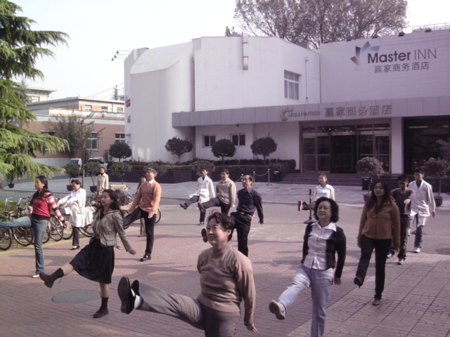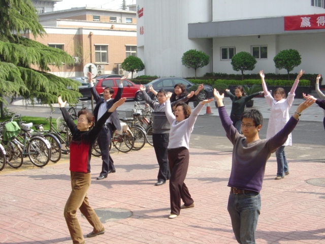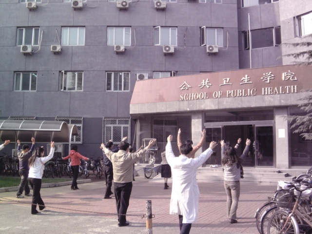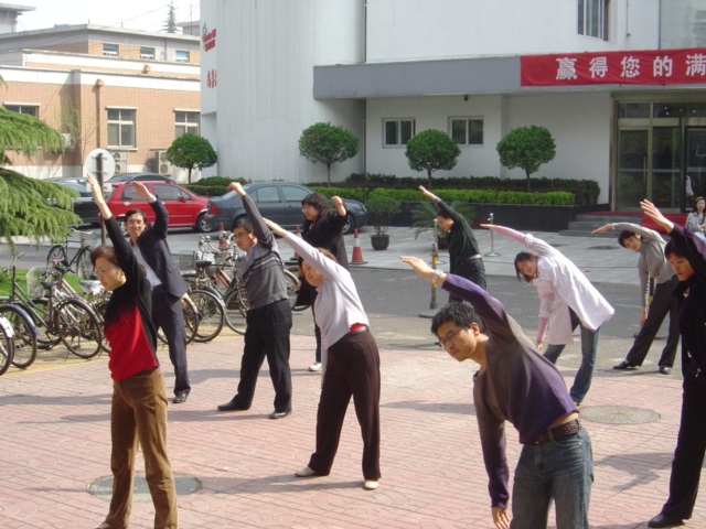 每天上午10点,公共卫生学院楼前就聚集了做操的人,音乐准时响起现在开始做第八套广播体操。每次总有十几个到20几个人随着音乐做操,也有2-3 个人的时候,无论人多少,音乐准时响起,提醒人们工作固然重要,健康更重要。学院一直重视职工的身体健康,不但组织各类活动,还把做广播操当做大事来抓,从今年三月由部分职工提议,院工会接受采纳并积极组织起来,学院领导郝卫东、徐善东、陈娟带头参加,并一直坚持到现在。每天上午8点工作到10点正好是应当稍稍休息的时间。因为电脑普及人们长时间坐在电脑前工作,使颈椎长时间处于屈曲位或某种特定体位,不仅使颈椎间盘内的压力增高,而且也使颈部肌肉长期处于非协调受力状态,颈后部肌肉和韧带易受伤,再加上扭转、侧屈过度,更进一步导致损伤,易于发生颈椎病。表现为颈、肩臂、肩胛上背及胸前区疼痛,臂手麻木,肌肉萎缩,甚至四肢瘫痪。我们经常看到不少老师一边说话,一边捶肩捶背,这是颈椎病的状态。颈椎病退行性病变是一个长期、缓慢的过程,并非一日之寒。因此,早预防、早发现、早治疗、才能拥有健康的生活!专家指出颈椎病的预防很重要,长期伏案工作者,应在12小时左右做一些运动,如有目的地让头颈部向左右转动数次,转动时应轻柔、缓慢,以达到该方向的最大运动范围为准。或行夹肩运动,两肩慢慢紧缩 35秒钟,尔后双肩向上坚持35秒钟,重复68次。当长时间近距离看物,尤其是处于低头状态者,既影响颈椎又易引起视力疲劳,甚至诱发屈光不正。因此每当伏案过久后,应抬头向远方眺望半分钟左右,可消除疲劳感又有利于颈椎的保健。以上这些运动,广播操都包括了,每天做三次,15分钟,正好达到缓解调理程度。美貌、财富、青春,都是1后面的零!如果没有生命, 没有健康, 你拥有的再多也是零! 只有健康的活着, 你才真正的拥有了个1。这个浅显的道理大家都明白, 但真正的能时时刻刻意识到, 或意识到能真正遵循健康第一的有多少人呢!每天上