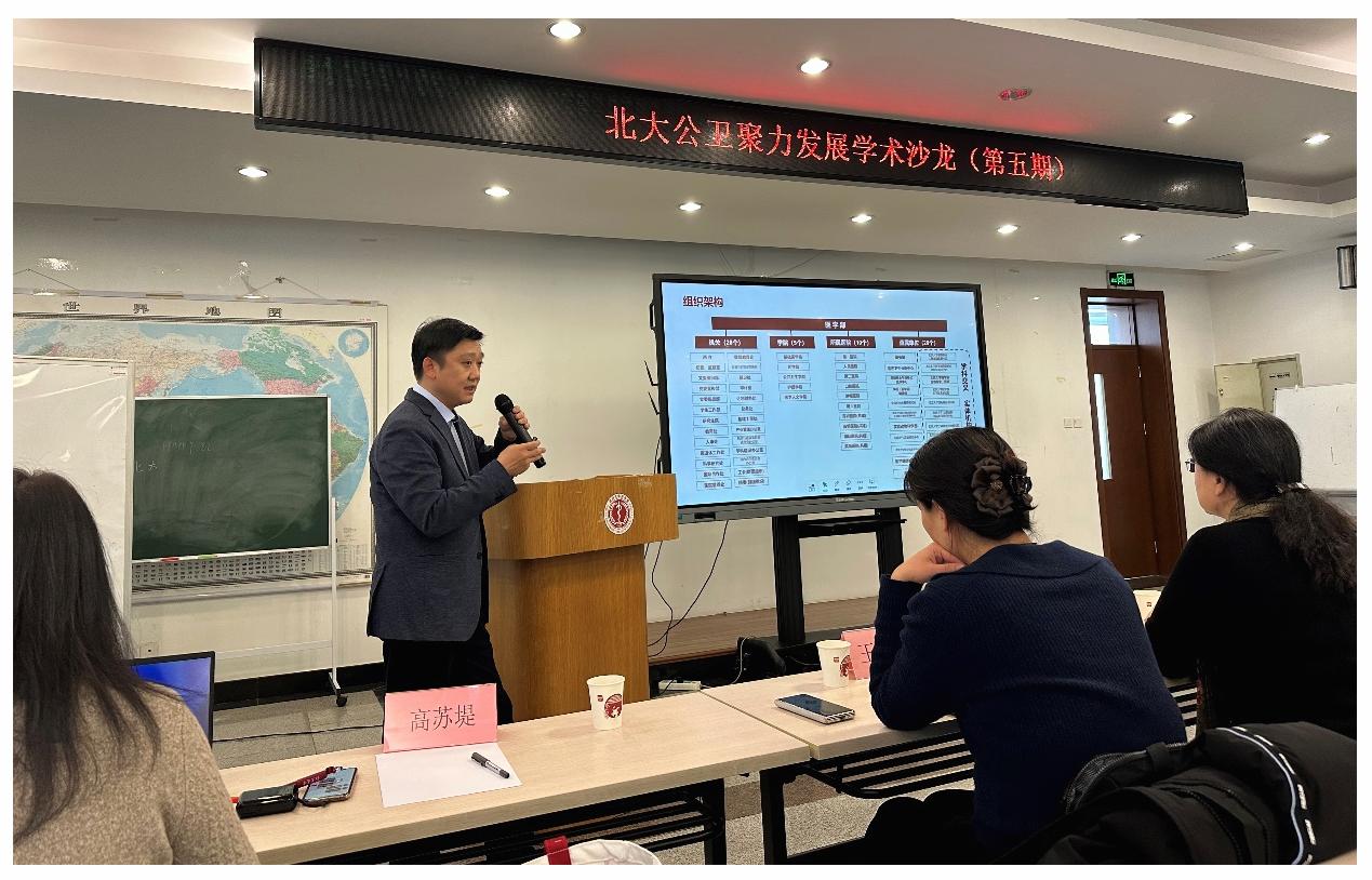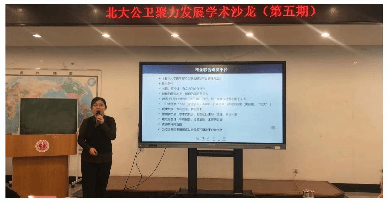 为让学院教师深入了解医学部科技成果转化的新理论、新政策、新动态,从而激发教师对科研成果转化工作的热情并推动转化工作。2024年1月10日,北大公卫聚力发展第五期学术沙龙在树华楼卫三教举行。活动邀请了北京大学医学部副主任肖渊老师、北京大学医学部产业管理办公室副主任沈娟老师分别就北大医学科技成果转化生态体系以及工作实践作专题报告。公共卫生学院院长詹思延、副院长王海俊及学院40多名教师参加了沙龙,活动由学院科研办主任高苏堤主持。