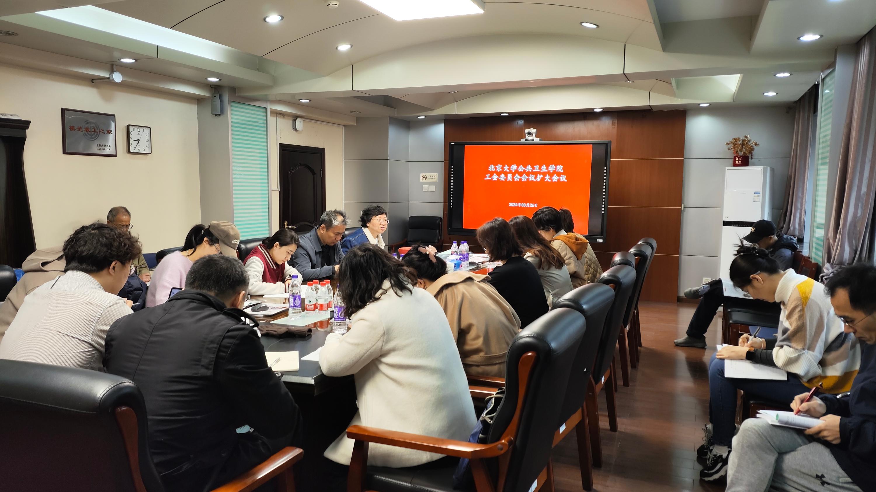 2024年3月26日上午,北京大学公共卫生学院工会召开2024年委员扩大会议,研究部署近期工作。学院工会委员金晓滨、王涛、闫蕾、杨健、李宏田以及15个工会小组组长参加会议,主管工会工作党委副书记苏鸿参会。会议由工会常务副主席闫蕾主持。