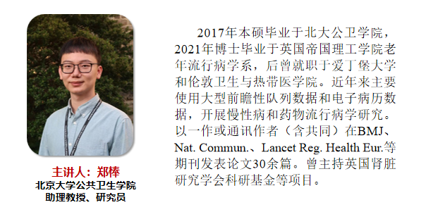 随后,郑棒老师围绕英国CPRD和OpenSAFELY大型电子病历数据库,分别汇报了老年痴呆症的老药新用研究和新冠特异性药物的药效实时评估研究,从问题的提出到解决方案的设计,再到数据分析和结果解读,整个过程娓娓道来,展示着新一代科研工作者的严谨认真、踏实真诚和一丝不苟的科研态度。