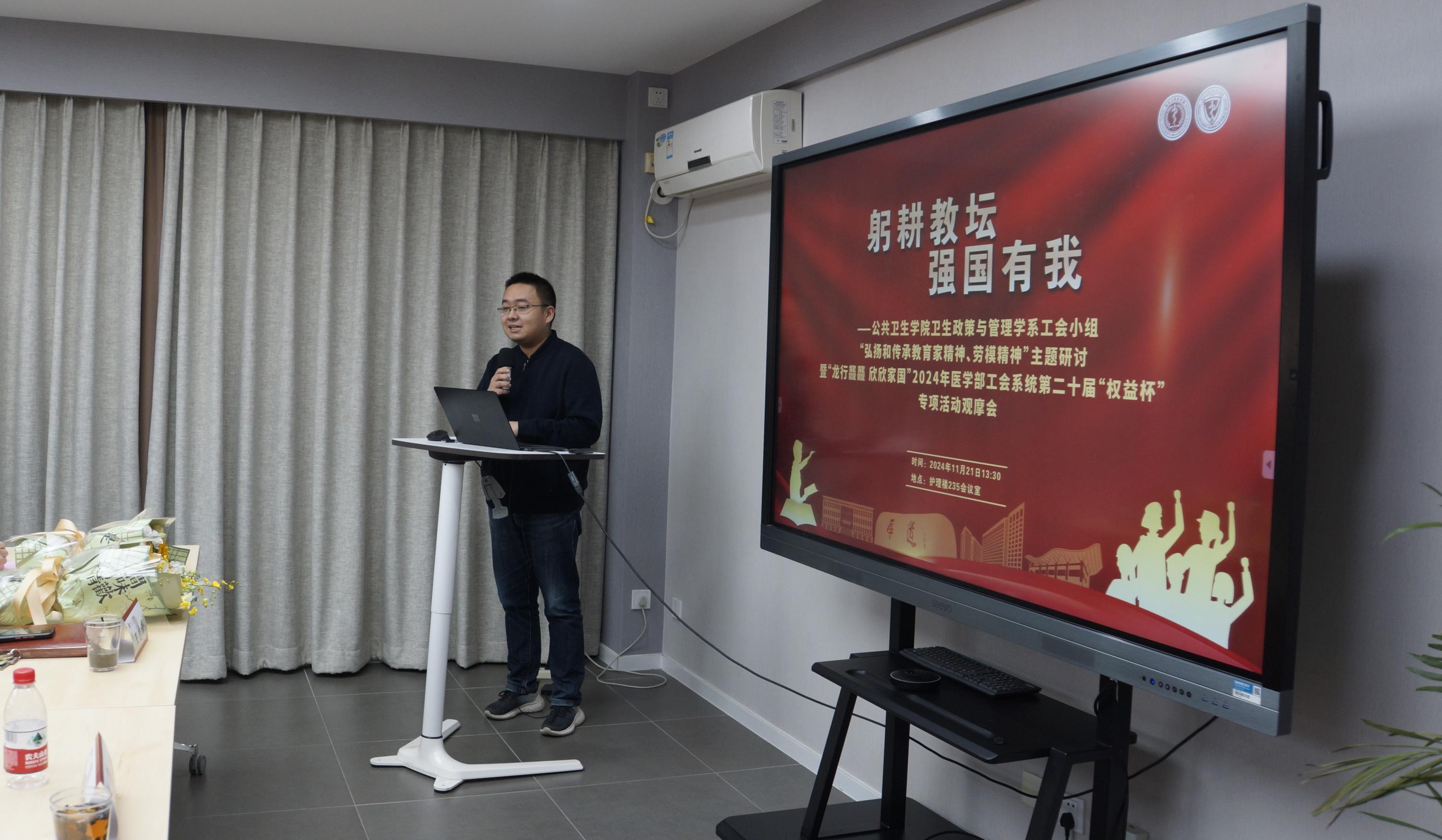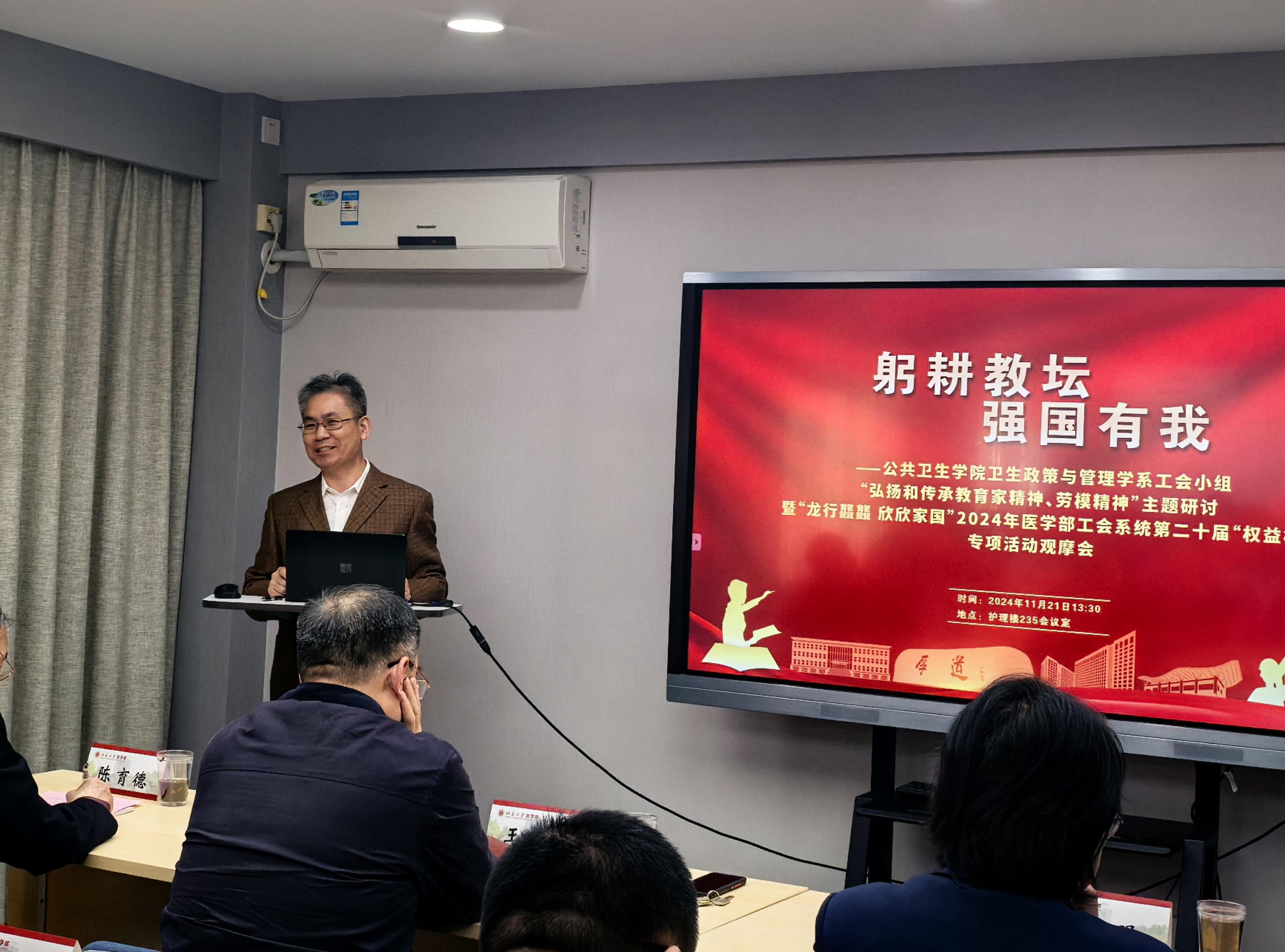 11月21日下午,北京大学公共卫生学院卫生政策与管理学系(以下简称卫管系)工会小组“弘扬和传承教育家精神、劳模精神”主题研讨暨“龙行龘龘 欣欣家国”2024年医学部工会系统第二十届“权益杯”专项观摩活动在卫管系235会议室顺利举行。作为医学部工会第二十届“权益杯”专项活动,活动邀请了原公共卫生学院院长、卫管系主任陈育德教授,原医学部主任助理、公共卫生学院副院长、卫管系主任吴明教授,原公共卫生学院副院长、卫管系副主任王志锋教授做主题发言。医学部工会副主席董惠华,北京大学肿瘤医院党委副书记、工会主席许秀菊,公共卫生学院党委副书记、工会主席苏鸿,公共卫生学院院长助理、卫管系主任简伟研,卫管系副主任傅虹桥,医学部工会办公室主任张凤云以及来自医学部各二级单位的工会领导和工会同仁参加了本次活动并进行了全程观摩。活动由卫管系工会组长陈博主持。