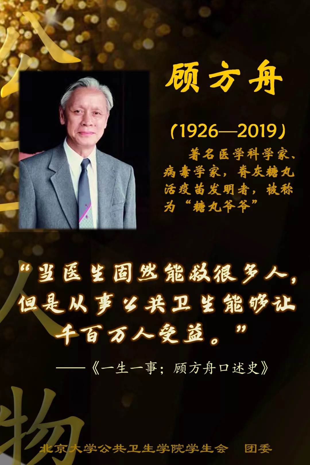 2019年1月2日,顾方舟先生逝世。陶行知先生说:“人生为一大事来,做一大事去”。我认为,这句话是对顾方舟先生最好的人生写照。顾方舟先生让我们明白,凡事贵在专,贵在对一件事情坚持不懈、持之以恒。顾先生告诉我们,世俗的很多东西都是虚无,而有些核心的东西却是舍命也要努力争取的。顾先生常说,他一生只做了一件事情,就是做了这一颗小小的糖丸。而就是这一颗小小的糖丸,它于社会、于人类有了至高的价值,它控制了中国人的脊髓灰质炎,也就在很大程度上控制了全人类的脊髓灰质炎。一颗小小的糖丸,拯救了无数孩子的健康和性命。