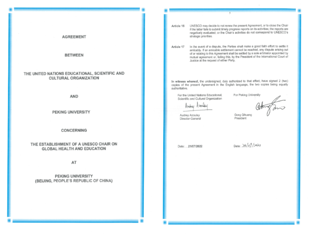 On December 31, 2022, UNESCO Chair on Global Health and Education at Peking University was established under the auspices of UNESCO, with Professor Yinghua Ma appointed as the chair holder.